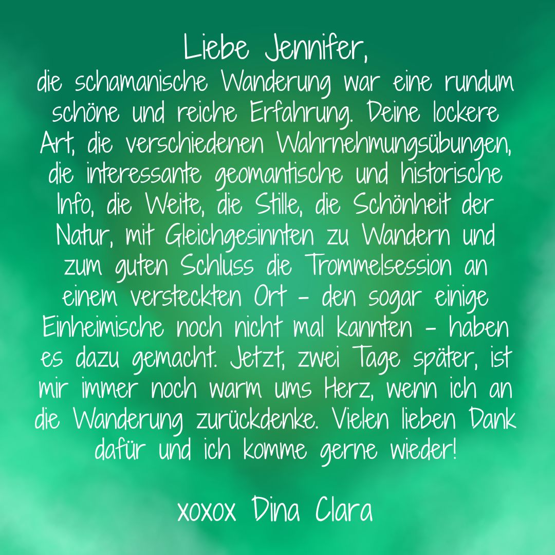 Ich verbinde Deinen Geist mit der Natur, dem Land, so tief, wie Du wahrscheinlich lange nicht verbunden warst. Ich berühre Deinen Körper mit meinen Händen und Deine Seele mit meiner Stimme, damit Du Dich dem Wandel öffnen und loslassen kannst.